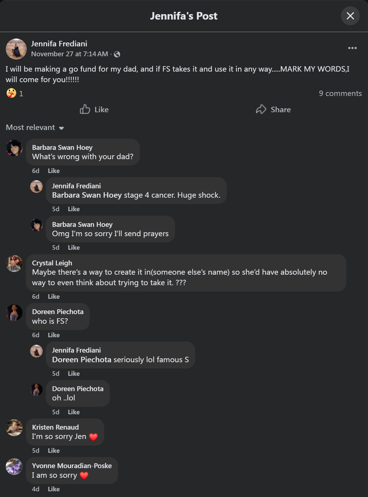 All feelings about Jennifa aside, we do not want to celebrate her father’s suffering and hope for the best for him. We encourage anyone to please donate to the GoFundMe. The funds will be used for his medical care, and if that fails then it will be used for his funeral costs I am sure.